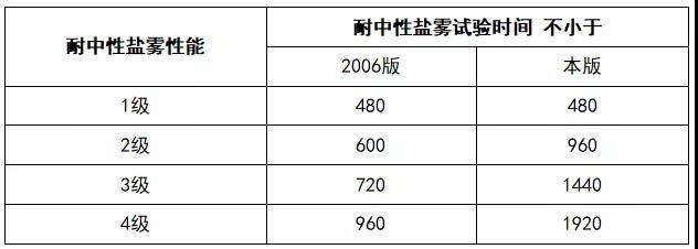 ▼ 綜合考慮彩涂板的使用環(huán)境、使用壽命和彩涂板的實(shí)物水平,彩涂板的耐中性鹽霧性能、紫外燈加速老化性能分為四個(gè)等級(jí)