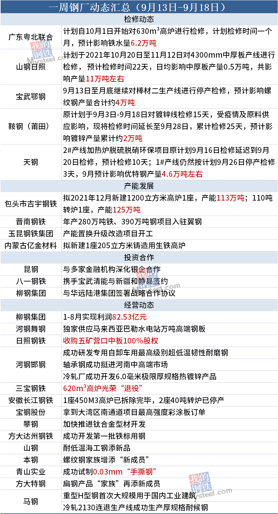 據(jù)Mysteel不完全統(tǒng)計,本周(2021年9月13日-9月18日)有5家鋼廠發(fā)布檢修動態(tài)
