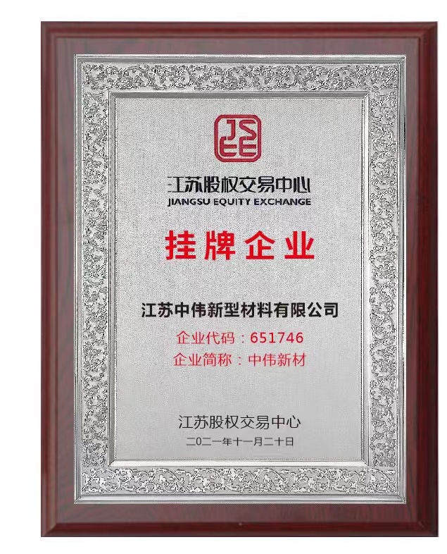 2021年11月20日 ,江蘇中偉新型材料有限公司在江蘇股權(quán)交易中心掛牌成立,標志著江蘇中偉新材在走向國際化、專業(yè)化的道路上邁出了跨越性的一步。