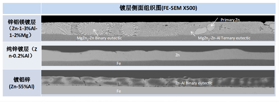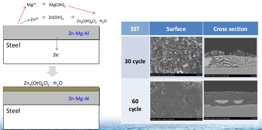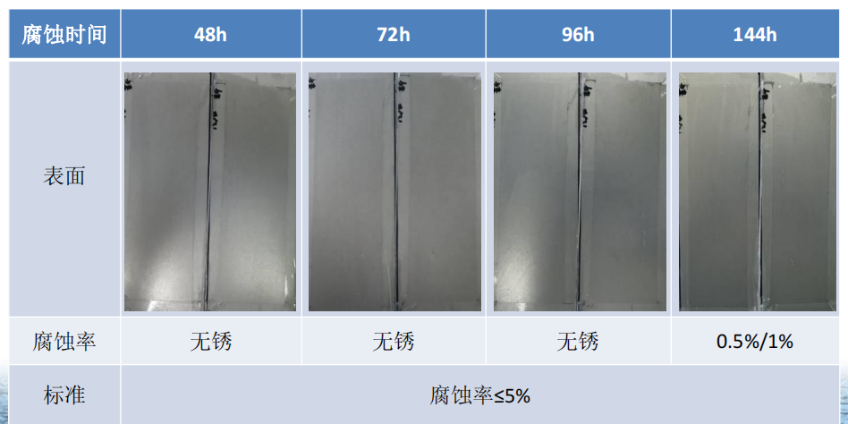 試驗(yàn)樣品:在同樣實(shí)驗(yàn)條件下純鋅鍍層重量為100g/m2,鋅鋁鎂鋅鋁鎂鍍層重量為70 g/m2 ,鋅鋁鎂鍍層產(chǎn)品表現(xiàn)出更優(yōu)的平面耐腐蝕性能。